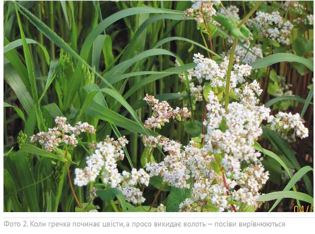 Згодом, коли гречка починає цвісти, а просо викидає волоть — посіви вирівнюються, рослини не конкурують, не пригнічують один одного і, на диво саме у сумісних посівах дають дещо вищі урожаї обох культур (фото 2).
