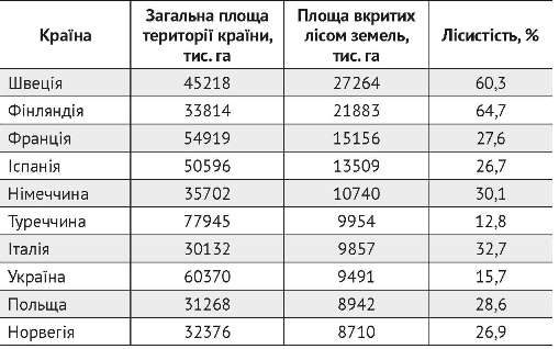 У багатьох країнах світу лісистість території значно вища, ніж в Україні. За даними ФАО, у Фінляндії вона становить 58,9%, у Швеції — 67,7%, Німеччині — 29%, Франції — 28,7%, в Італії — 21,2%, Канаді — 26,6%, у США — 32,7%, в Росії — 50,5%, тоді як в Україні — 15,6%. Лише у Туреччині, якщо її можна назвати європейською країною, лісистість менше нашої — 12,8% (табл. 1).
