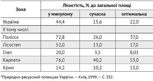 Сьогодні Україна є найменш лісистою країною, вона не забезпечує власних потреб у деревині. Тому її лісистість слід довести до 20–22% проти 15,9%, хоча вона не може бути однаковою для всієї території України. У різних фізико-географічних зонах вона повинна бути різною (табл. 2).