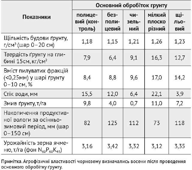 Проведення безполицевого розпушування скиби сприяє покращенню фільтраційних властивостей і водного режиму еродованих чорноземів, особливо при надходженні великої кількості зимових опадів на талий ґрунт. Волога, що акумулюється у глибоких горизонтах, менше втрачається на випаровування, вимерзання та видування і більш продуктивно використовується рослинами ячменю. В середньому за три роки у 1,5-метровому шарі ґрунту впродовж осінньо-зимового періоду тут накопичилось 125 мм доступної вологи проти 82 мм за оранки і 73 мм за мілкого плоскорізного обробітку (табл. 1).