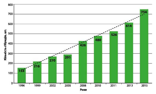 Відповідно до висновків науковців, протягом найближчих років весь світовий приріст виробництва продукції рослинництва буде досягнуто за рахунок селекції, тобто нових сортів чи гібридів, їх корисних властивостей та якісних показників. Проведений аналіз динаміки занесення гібридів кукурудзи до Реєстру сортів показав, що за 19 років кількість занесених до Реєстру гібридів кукурудзи збільшилась майже уп’ятеро зі 156 (1996 р.) до 754 шт. (2015 р.) (рис. 1).