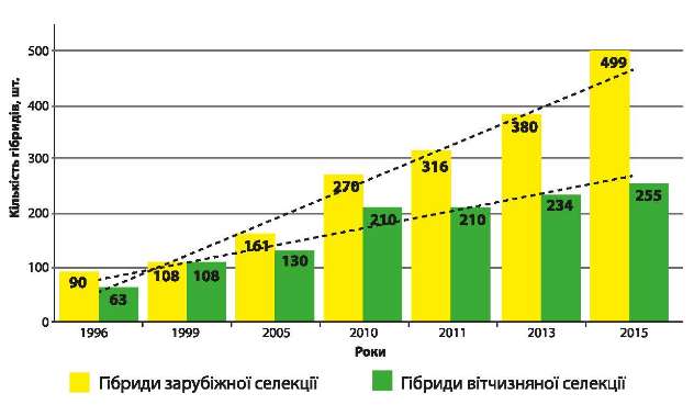 Не тільки збільшувалась кількість гібридів, а і їх особливості. І перш за все слід виділити, що підвищується кількість гібридів зарубіжної селекції (рис. 2).