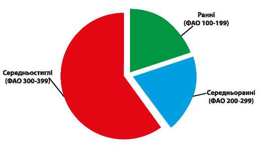 Клімат північно-східного Лісостепу України є помірно-континентальним із нестійким зволоженням, але в окремі роки та впродовж одного й того ж року характеризується недостатньою кількістю вологи. Розподіл опадів впродовж року та по території нерівномірний. Таким чином, погодні умови сприятливі для вирощування кукурудзи з ФАО 150–399. Вирощування гібридів із ФАО 100–149 є економічно не вигідним, оскільки повністю не використовуються кліматичні умови зони і формують низький рівень урожайності. Вирощування гібридів із ФАО 400–599 на зерно в цій зоні недоцільне (формується зерно з високою вологістю та недозріле, що призводить до невиправданих витрат на технологію) тільки на силос. У Лісостеповій зоні з метою досягнення сталого виробництва і надійного визрівання зерна, а також скорочення витрат енергії і палива на збирання і післязбиральну доробку врожаю необхідно додержуватись орієнтовного співвідношення різних біотипів кукурудзи (рис. 5).