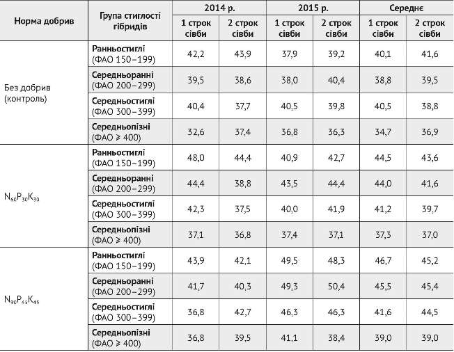 Результатом впливу наведених показників у середньому за 2014–2015 рр. стала істотно вища врожайність зерна кукурудзи у середньопізньої та середньостиглої груп — 8,6 та 8,4 т/га, а групи середньоранніх та ранньостиглих гібридів поступалися за урожайністю на 1,0 та 1,4 т/га, тоді як між окремими гібридами (Штандарт — ДН Пивиха) різниця за показниками середньої урожайності зерна становила близько 2 т/га. Високий рівень продуктивності (8,69–9,17 т/га) в середньому за 2014–2015 рр. формували на фоні N60Р30К30 або N90Р45К45 середньопізні гібриди Штандарт, ДН Вайткорн і ДН Гетера, а також гібриди ДК Велес і ДБ Хотин за сівби при tгр.=8–10 °C і, крім того, гібриди Збруч та ДН Рута — за сівби при tгр.=12–14 °C.