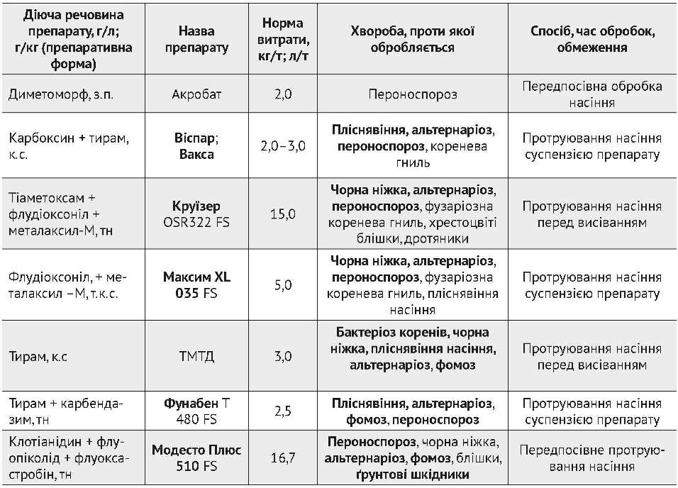 Обов’язковим заходом проти хвороб ріпаку, збудники яких передаються насінням, є знезараження насіння проти зовнішньої та внутрішньої інфекцій, дозволеними до використання на Україні фунгіцидами-протруйниками (табл. 1).