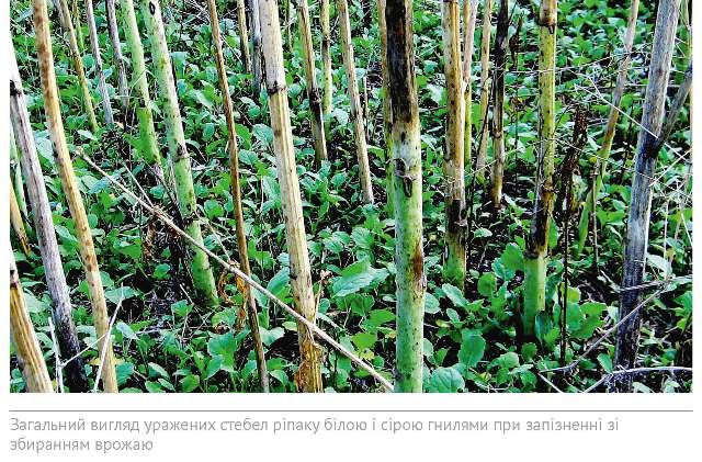 У 2017 р. розвиток гнилей за наявності високої (60–90%) вологості повітря і температур 17–27°С у фазі цвітіння-зеленого стручка рослин відбуватиметься передусім на забур’янених, загущених полеглих посівах, на полях, де ріпак розмістили після нерекомендованих попередників (соняшник, льон, коноплі, конюшина, соя, гречка, капуста, огірки).