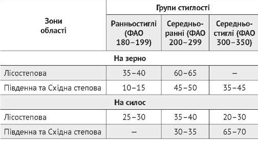 Рекомендований гібридний склад кукурудзи на зерно по групах стиглості на товарних посівах подано в табл. 1.