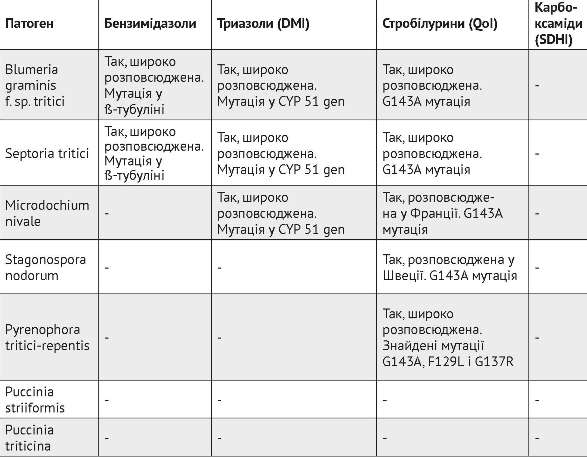 Беручи до уваги дані з таблиці, необхідно ретельно планувати застосування фунгіцидів протягом вегетації, щоб уникнути формування резистентності збудників хвороб пшениці до фунгіцидів, та звертати увагу на відносно нові фунгіциди — інгібітори сукцинатдегідрогенази ІІ покоління (карбоксаміди, або SDHI).