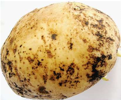 Рис. 1. Симптоми проявлення ризоктоніозу (чорної парші) на бульбі картоплі
