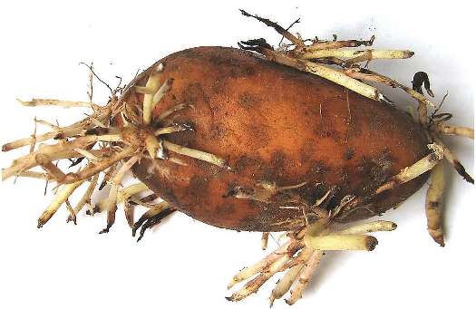 Зі слабко уражених ростків формуються рослини, які відстають у рості й розвитку, а деякі з них згодом в’януть і гинуть. При незначному заселенні бульб склероціями патогена ураження паростків майже не відбувається.