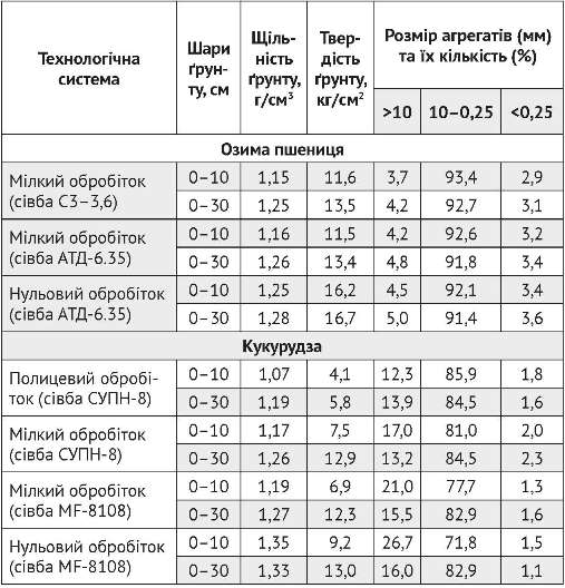 Найбільш доведеним наслідком запровадження «нульових» технологій є підвищення щільності і твердості ґрунту, однак ця закономірність значною мірою коригується його вологістю, ступенем гумусованості, структурним та гранулометричним складом. За нашими даними, після двох років застосування плужного, мілкого та нульового обробітку об’ємна маса орного шару на час сівби кукурудзи сягала 1,19; 1,26–1,27 та 1,33 г/ см³, а твердість, відповідно, 5,8, 12,3–12,9 і 13,0 кг/см² (табл. 1). Тобто на чорноземі з умістом фізичної глини менше 50% параметри зазначених характеристик весною на необроблених ділянках не виходили за межі допустимих для просапної культури величин, що свідчить про можливість радикальної мінімізації процесів обробітку ґрунту.