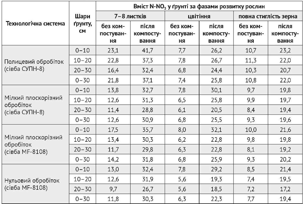 Наступного року при вирощуванні кукурудзи відмова від зяблевого обробітку супроводжувалась зменшенням кількості нітратного азоту в ґрунті. Так, у фазі 7–8 листків орний шар на дворічному полицевому агрофоні містив 21,8, мілкому плоскорізному — 12,6–14,2, нульовому — лише 11,8 мг/кг N-NO3 (табл. 2).