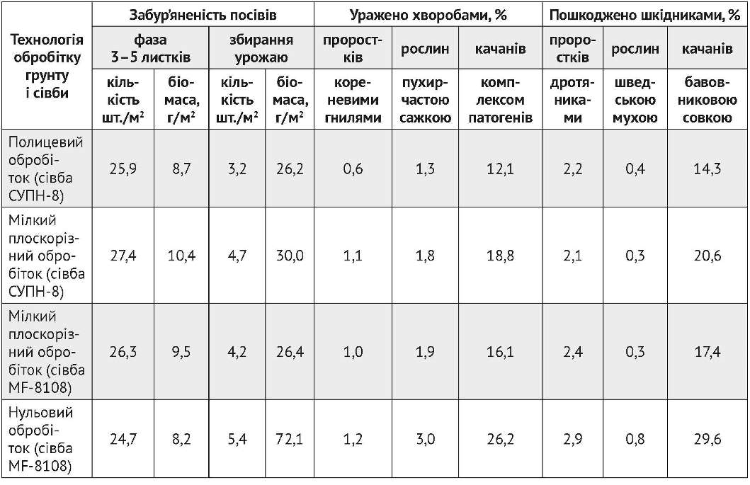 Під час збирання урожаю в посівах домінували мишій та плоскуха звичайна, при цьому за нульового обробітку швидше відновлювались амброзія полинолиста, злинка канадська, щириця. Показово, що при незначних відмінностях у рясності бур’янів по варіантах досліду (3–5 шт./ м²) їх повітряно-суха маса була різною (оранка — 26, мілкий обробіток — 26–30, нульовий — 72 г/ м²) (табл. 3). Таким чином, поєднання хімічних (ґрунтові та страхові гербіциди) і механічних (міжрядне прополювання) заходів боротьби дозволяє знизити забур’яненість посівів до економічно безпечного рівня. За прямої сівби (без міжрядної культивації) потенціал шкодочинності бур’янів помітно зростає, що свідчить про необхідність удосконалення способів їх контролювання у зв’язку з неоднорідністю фазового стану, зміною структури і резистентності.