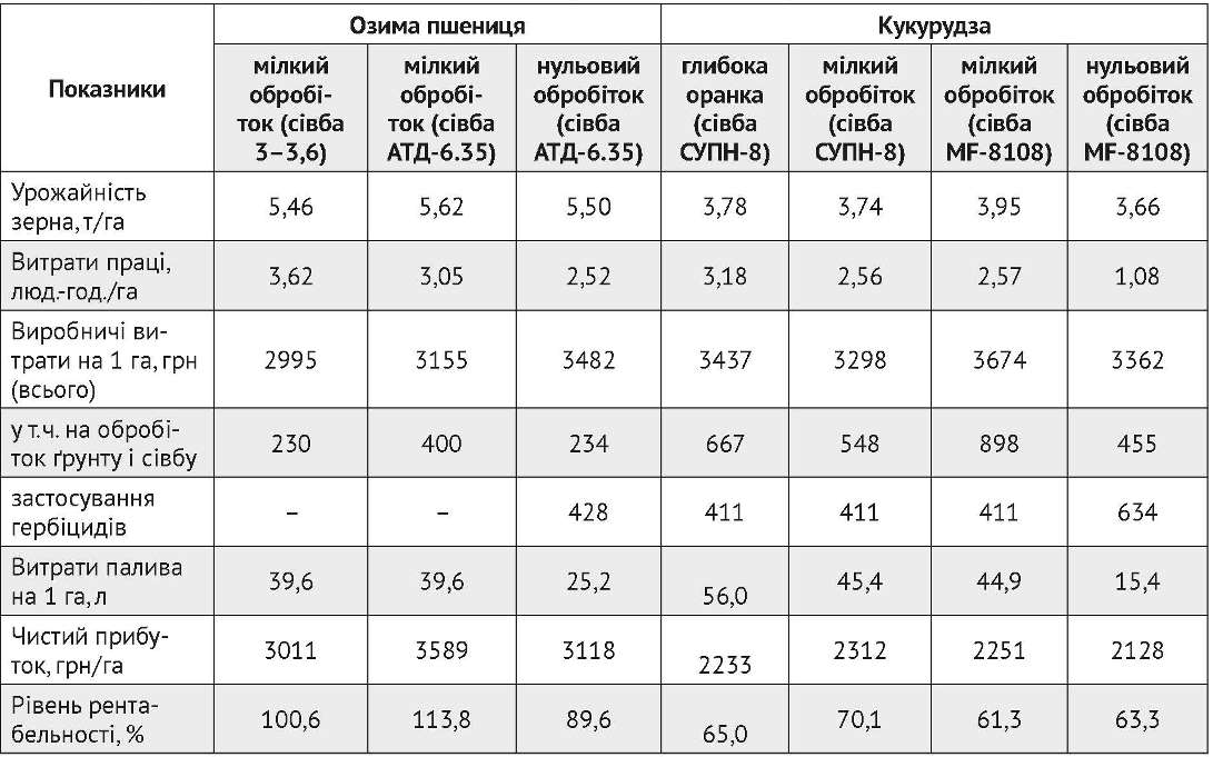 Вагомим чинником, який не дозволяє повною мірою реалізувати потенціал нульового обробітку в царині економічної ефективності виробництва, є диспаритет цін між вартістю сільськогосподарської продукції та засобів захисту рослин, добрив і техніки. За нашими розрахунками, пряма сівба озимої пшениці та кукурудзи забезпечила, порівняно із контролем, економію палива (14,4–40,6 л/ га) і зниження витрат праці на 1,1–2,1 люд.-год./га.