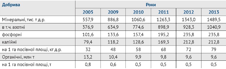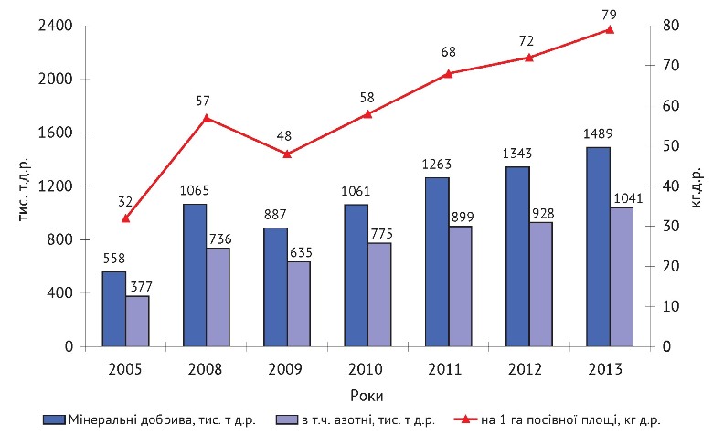 За офіційною статистикою в Україні спостерігається стійка тенденція до збільшення обсягів внесення мінеральних добрив. Якщо у 2009 році вносилося 887 тис. т мінеральних добрив у діючій речовині, то за підсумками 2013-го –1490 тис. т. д.р. При цьому обсяги внесених добрив розрахунково на 1 га посівної площі за останній п’ятирічний період збільшилися із 48 до 79 кг поживної речовини. Закономірним є отримання високих урожаїв в періоди активного внесення мінеральних добрив. Виробництво зерна впродовж 2009–2013 років (окрім 2010) не опускалося нижче 46 млн т. До того ж, торік за найбільшого внесення добрив у розрахунку на 1 га аграрії отримали рекордний урожай, який перевищив 63 млн т.