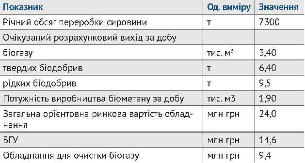 Таблиця 3. Основні характеристики біогазової енергетичної системи для
