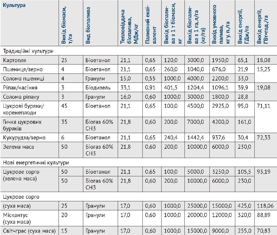 Порівняльний аналіз таблиці 1 в розрізі сільськогосподарських культур, які займають найбільші площі посіву (а це сьогодні передусім зернові, ріпак і кукурудза), свідчить, що за виходом біопалива в літрах-кілограмах з 1 га найкращі показники за умов дотримання технології вирощування забезпечує зелена маса кукурудзи, яка є досить енергоємною сировиною для одержання біогазу, а також солома пшениці і ріпаку в якості твердого біопалива при виробництві його у вигляді гранул. Останні цілком можна використовувати як для власних потреб, так і на продаж, в тому числі закордон, де вони користуються значним попитом, особливо в країнах ЄС. Так, за інформацією Українського біопаливного порталу Pelleta.Com.Ua, на європейському ринку ціна якісних запакованих (20 кг) гранул становить від 7 до 8 євро, тобто 1 т їх коштує у перерахунку близько 7200 грн.