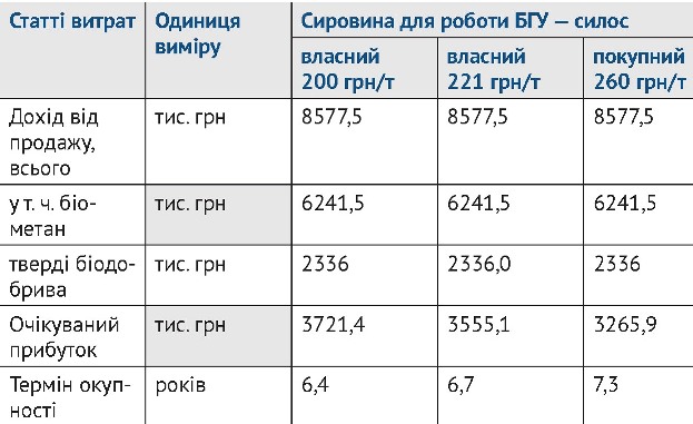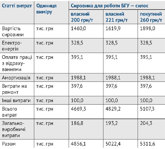 У розрахунках для порівняння використано дані офіційної статистики щодо середньої ціни купівлі сільськогосподарськими підприємствами силосу в 2013 р., що становила 266 грн/т, тоді як собівартість виробництва — 221,9 грн. Також передбачено варіант, де собівартість виробництва силосу найменша — 200 грн.