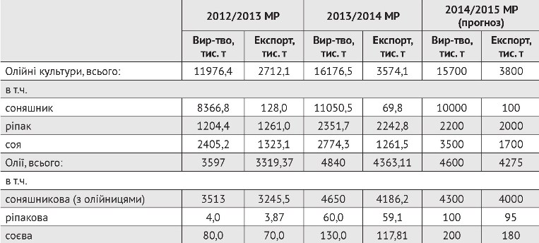 Виробництво та експорт основних видів олійних культур та олійно-жирової продукції