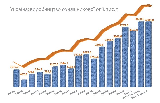 Україна залишається лідером на ринку соняшникової олії. Всього у світі продається 71 млн т усіх олій: 44 млн т пальмової, 9,6 — соєвої, 4 — ріпакової. Соняшникова у структурі продажів посідає третє місце. В обсягах світового експорту олії соняшникової українська олія займає майже 60 %. Наша перевага в тому, що ця галузь є експортно орієнтована, адже всередині країни споживаємо лише до 20% виробленої олії.