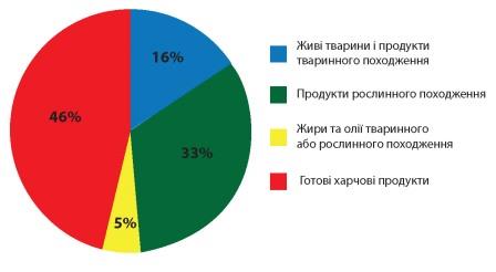 Представлена діаграма 1 досить чітко характеризує нинішній суперечливий стан: наша країна здебільшого здійснює ввезення з-за кордону продукції з високою доданою вартістю, адже на готові харчові продукти припадає близько 46% всього аграрного імпорту, тоді як левову частку вітчизняного експорту становлять сировині товари — зернові та олійні культури і окремі з них, які за певної умови можна віднести до високодохідних продуктів їх переробки — жири та олія.