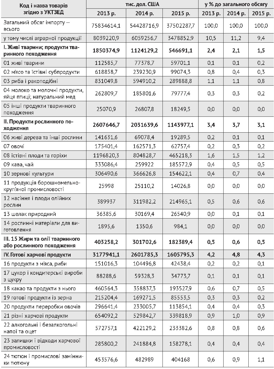 Впродовж 2013–2015 рр. загальний обсяг імпорту скоротився удвічі — з 75834,6 млн дол. до 37502,3 млн дол., зокрема, й аграрної продукції — відповідно з 8032,2 млн дол. до 3478,8 млн дол. При цьому найбільше знизився імпорт в абсолютному вартісному вимірі у товарній групі: «Готові харчові продукти» на 1572,1 млн дол., або 49,5%, «Продукти рослинного походження» відповідно на 1463,7 млн дол., або 56,1% і «Живі тварини; продукти тваринного походження» — на 1303,7 млн дол., або 70,5%.
