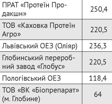 Виробничі потужності підприємств із переробки сої, тис. т/рік
