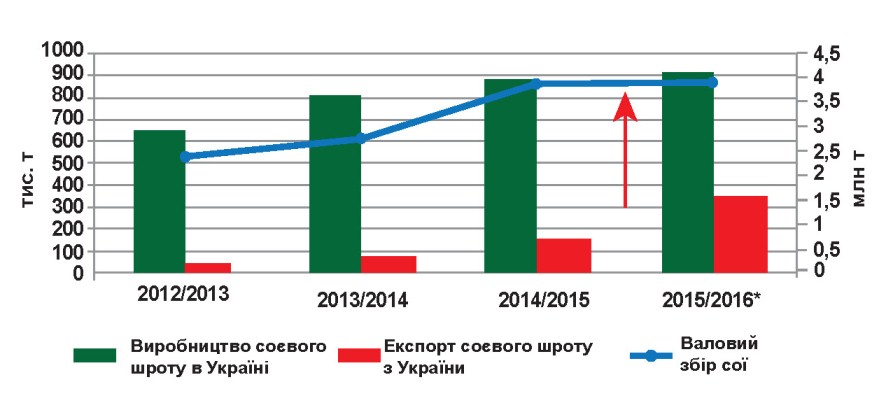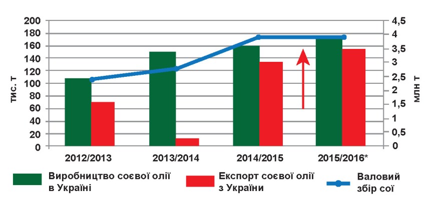 Серед світових експортерів сої найпотужнішими наразі є Бразилія та США. За минулий сезон ці країни експортували близько 50 млн т кожна. Наступна трійця — Аргентина, Парагвай та Канада — за обсягами експорту не перевищували 10 млн т. Україна посіла 6 місце і, хоча на світові показники наші здобутки суттєво не впливають, динаміка виробництва сої в країні демонструє сталу позитивну тенденцію. Аналітики «Українського клубу аграрного бізнесу» відзначають зменшення обсягів експорту власне соєвих бобів, натомість зростають обсяги переробки — на 114% у 2014–2015 МР порівняно з 2011–2012. Відтак, збільшується і експорт соєвої олії та шроту — на 30% у сезоні 2014–2015 порівняно з 2011–2012 МР.