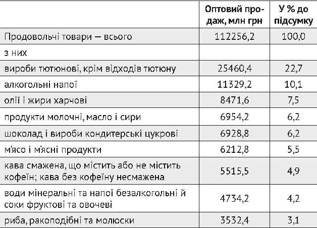 У І півріччі 2016 р. за попередніми даними підприємствами оптової торгівлі було реалізовано продовольчих товарів на суму 112,3 млрд грн. Із продовольчих товарів найбільше було реалізовано тютюнових виробів, алкогольних напоїв, олій і жирів харчових, молочних продуктів, масла і сирів, шоколаду і виробів кондитерських цукрових, м’яса і м’ясних продуктів, кави, а також вод мінеральних та напоїв безалкогольних (табл. 1).