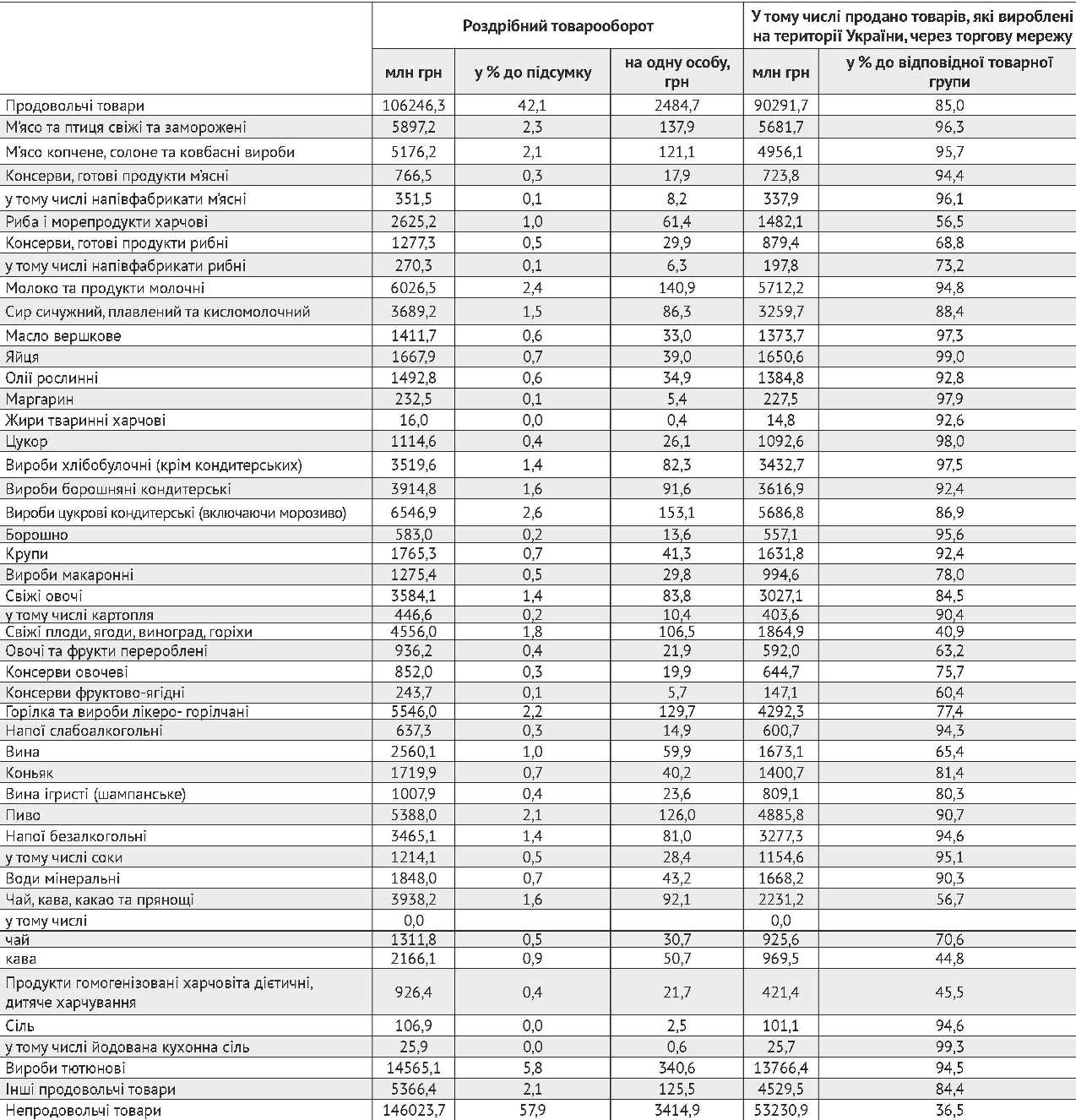 За 6 місяців 2016 р. роздрібний товарооборот продовольчими товарами в Україні становив майже 106,3 млрд грн., або 42,1% від загального його обсягу включно з непродовольчими товарами. При цьому частка товарів вітчизняного виробництва, які були продані через торгову мережу, сягала 85%. Найвищою вона виявилася за такими групами продовольчих товарів, як «яйця» (99%), «цукор» (98%), «маргарин» (97,9%), «вироби хлібобулочні крім кондитерських» (97,5%), «масло вершкове» (97,3%), «м’ясо та птиця свіжі та заморожені» (96,3%).