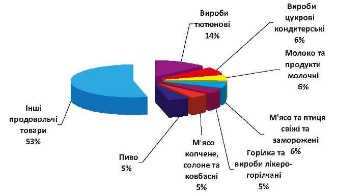 Ємність внутрішнього продовольчого ринку за структурою роздрібного товарообороту в І півріччі 2016 р. характеризувалася наявністю 7 видів товарів, які в сукупності займали майже 47% усього його обсягу. Серед цих товарів найбільша питома вага припадала на тютюнові вироби — 14%, окремо по 6% на вироби цукрові кондитерські, молоко і продукти молочні, м’ясо і птицю свіжі та заморожені та по 5% — на горілку і вироби лікеро-горілчані, м’ясо копчене, солоне і ковбасні вироби та пиво (діагр. 1).