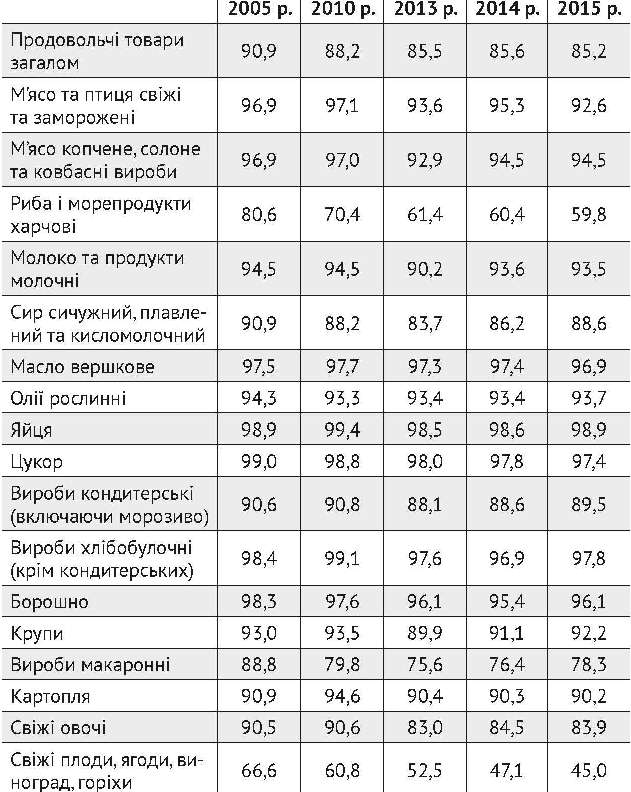 Суттєво зменшалася у структурі також і питомої ваги продовольчих товарів вітчизняного виробництва в групі «свіжі овочі» (– 6,6%) і «м’ясо і птиця свіжі та заморожені» (–4,3%) відповідно. Без значних змін залишалися такі продовольчі товари, як масло вершкове, олії рослинні, яйця, вироби хлібобулочні, крупи, картопля.