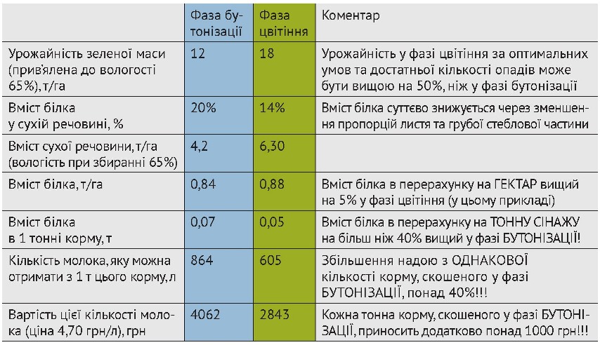 Оптимальною стадією для початку скошування люцерни є фаза бутонізації. Коли люцерна входить у фазу цвітіння, її урожайність буде вищою, ніж у фазі бутонізації. Разом з тим, вміст білка та енергії суттєво знижується. І якщо навіть урожайність та вміст білка на одиницю площі будуть вищими у фазі цвітіння (вирощування люцерни на поливі), від цього споживання корму коровою не збільшиться.