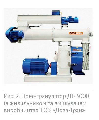 Відомі й інші розробки виробництва ТОВ «Доза-Гран» — прес-гранулятори серії ДГ, призначені для виробництва паливних гранул з тирси, соломи, лушпиння, торфу та ін. Гранулювання дозволяє знизити питомі витрати на виробництво, скоротити втрати при зберіганні і транспортуванні, забезпечити збереження продукту протягом тривалого часу. Зазначені конструкції грануляторів мають ряд переваг, а саме: висока енергоефективність і надійність конструкції, простота обслуговування і низькі експлуатаційні витрати. Конструкція дозатора із захистом від забивання дозволяє забезпечити точність дозування при подачі сировини, рівномірно і якісно проводити зволоження продукту (рис. 2).