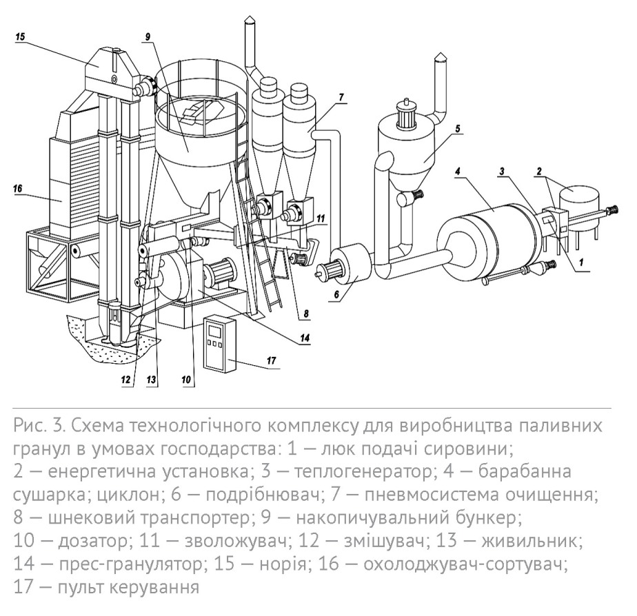 На рис. 3 показано технологічний комплекс, який найкраще придатний для виготовлення біопаливних гранул в умовах сільськогосподарського підприємства. Запропонована технологічна лінія відображає сприятливу для умов типового господарства технологію виробництва паливних гранул, що здійснюється за багатьма техніко-економічними критеріями. Завдяки комплектації комплексу різним додатковим обладнанням проходження процесу виготовлення твердого біопалива відбувається на високому технологічному рівні з дотриманням технічних вимог.