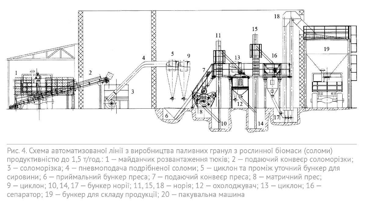 Для виробництва паливних гранул в умовах АПК пропонується автоматизована лінія з виробництва паливних гранул з біомаси (соломи) продуктивністю до 1,5 т/год. виробництва ПАТ «Дозавтомати», технологічна схема якої зображена на рис. 4.
