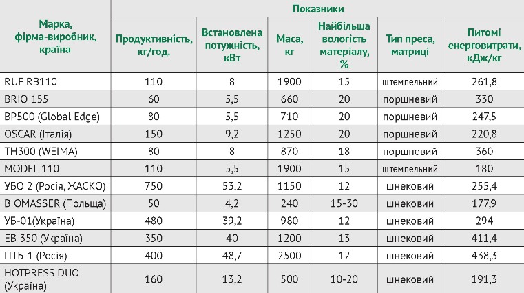 Наявні на ринку машини для гранулювання та брикетування за типом робочих органів класифікують на поршневі, штемпельні (пуансоні) та шнекові (гвинтові). Найбільшої популярності набули установки з гвинтовими робочими органами, наприклад: ЕВ-350 (ВАТ «Черкаселеватормаш»), МБ-01 (ВАТ «Пресмаш», м. Івано-Франківськ); ШПБ-700 (НВО «Теплодар», м. Полтава), УБО-2 («Жаско», Росія) та ін. На основі результатів пошуку розглянемо основні порівняльні характеристики відомих пресів для виробництва паливних гранул з рослинної біомаси, які наведено в таблиці 3.