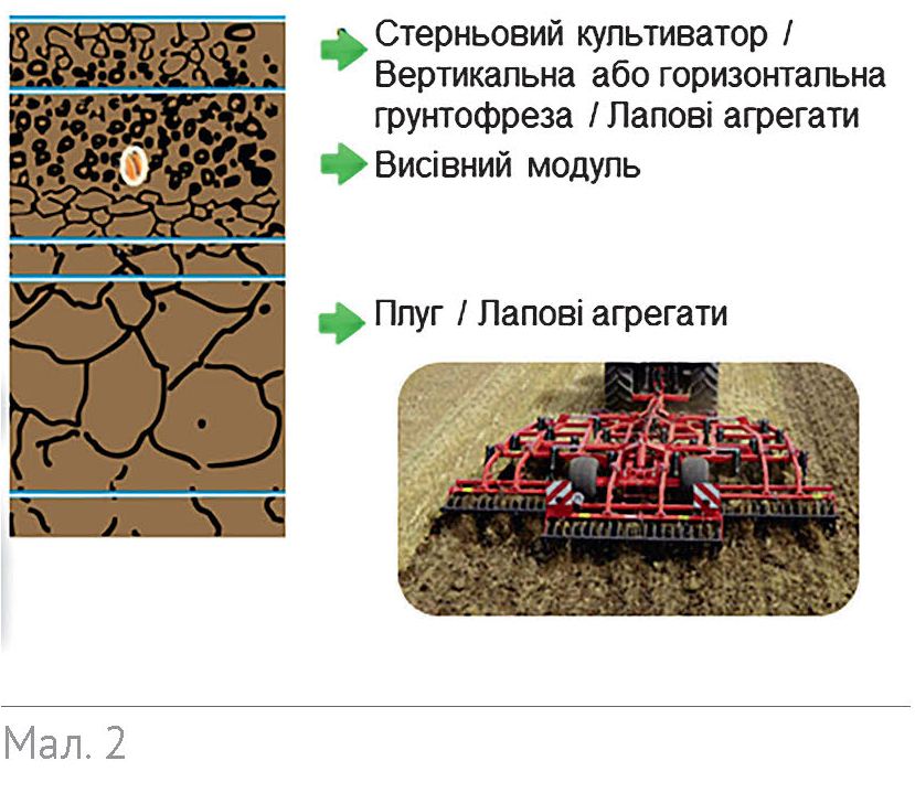 5. Розмістити насіння у грунт із фрагментарною структурою, яка забезпечить найкращий розвиток коріння, в т.ч. в глибину. Ідеальний вертикальний розріз грунту, наприклад для пшениці, складається із першого верхнього шару з грудками розміром 1-3 см, які запобігають замулюванню після дощів та ерозії, другого — з мілких грудочок, які оточують насінину, третього — більш спресованого шару, на якому розташовується посівне ложе і яке забезпечує коріння водою на початку вегетації, та четвертого — без підошви, не спресованого, без накопичення рослинних решток, без порожнин (мал. 2).