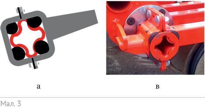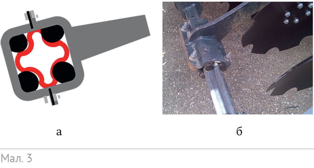 Увігнуті диски діаметром 460 мм та товщиною 5 мм попарно монтуються на окремих осях, розташовуються під кутом як до горизонталі, так і вертикалі, обробляючи поверхневий шар на глибину 5-8 см. Їх загальна кількість дорівнює кількості рядків сівалки і, зокрема, для 6-метрової сівалки становить 40 дисків. Штанги, до яких кріпляться диски, монтуються до фасонної рами через поліуретанові стрижні (мал. 3а та 3б). Завдяки спеціальному профілю рами кутове переміщення дисків із штангою призводить до стискання поліуретанових блоків без їх зсуву, сприяючи швидкому поверненню штанги з дисками в робоче положення після огинання перешкоди. Глибина роботи дисків легко та швидко регулюється за допомогою прокладок.