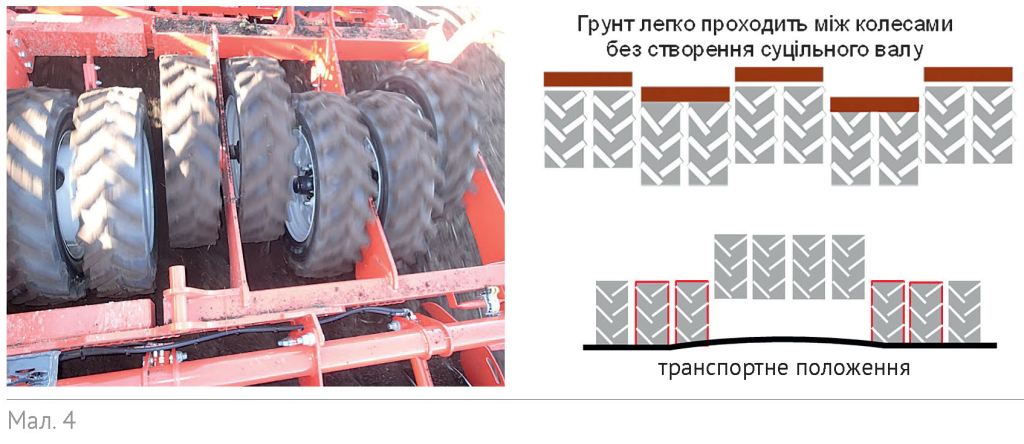 Батарея ущільнюючих коліс (10 коліс у 3-метрової та 20 у 6-метрової сівалок) діаметром 900 мм (для зменшення опору) та шириною 215 мм. Ці ущільнюючі колеса мають ідеальний прямокутний профіль, обробляючи весь горизонт та створюючи однорідне, без пустот середовище, в якому надалі розміщується насіння з відмінним контактом з оточуючим грунтом. За кожним колесом наслідують по два висівних рядки. Тому всі сошники працюють в однакових умовах. Протектори коліс мають глибокий та гострий профіль, розриваючи та подрібнюючи верхній шар грунту, який ще раз прикочується невеликими колесами вже після проходу сошників. Сусідні колеса розташовані із зсувом 200 мм (мал. 4) для полегшення проходження грунту між колесами і зменшення необхідного тягового зусилля трактора. В транспортному положенні центральні колеса піднімаються для кращого копіювання поперечного профілю дороги, надання стабільності під час руху, кращого гальмування та зменшення зносу коліс.