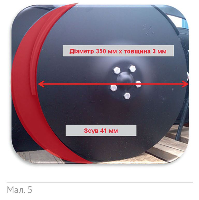 Висівна балка на міжряддя 15 мм з дводисковими сошниками діаметром 350 мм, товщиною 3 мм та відносним зсувом дисків один до другого в 41 мм (мал. 5).