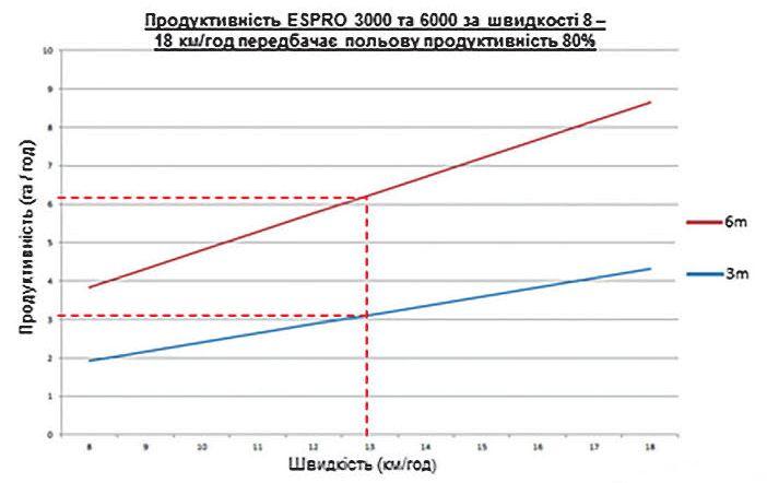 На мал. 6 представлено залежність робочої продуктивності висіву сівалок шириною 3 та 6 м від швидкості. При середній швидкості руху 13 км/год. з прийнятою польовою продуктивністю 80% висівається 1 га за 1 год. одним метром ширини сівалки. Тобто робоча продуктивність 6-метрової сівалки сягає 6 га/год., а за робочий день у дві зміни можна засіяти 100 га ріллі.