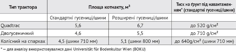 Навіщо тут чотири гусениці? Все просто: така незвична конструкція надає трактору декілька важливих переваг: зокрема, забезпечує велику площу контакту машини з поверхнею, що зменшує ущільнення ґрунту (див. табл.).