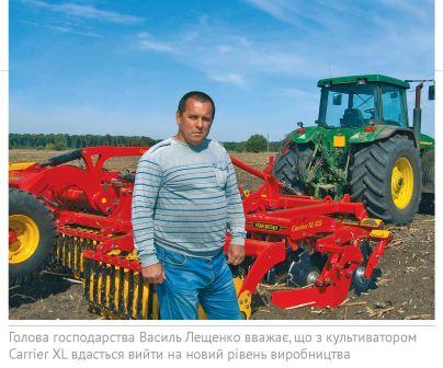 «Я домовився з фірмою про поставку цього обладнання, — розповідає Василь Лещенко. — Проплатив 20 % передоплати за нього, і вже незабаром культиватор був у мене. Я дуже задоволений ним».