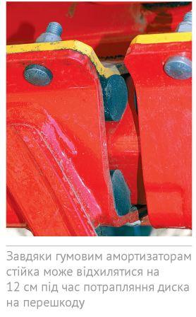 Кожна стійка диска обладнанна спеціальними гумовими амортизаторами. Коли на шляху диска культиватора трапляється будь-яка перешкода, то стійка відхиляється до 12 см і потім вертається знов на місце у робоче положення. Таким чином, і поле розпушується, і агрегат залишається цілим.