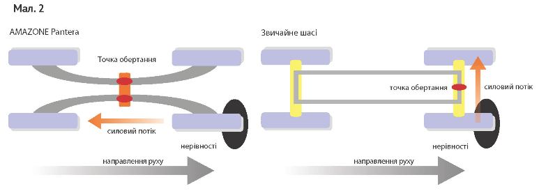 Красиво йде Пантера, але, що дивно: коли на її шляху трапилась вибоїна, то машина лише трохи покосилася на один бік — переважну різницю рівня поверхні покрили підвіска та шасі. «Це одна з її головних переваг, — пояснює мені Валерій Смолін. — Тут, на надміцній рамі, стоїть гідропневматична підвіска та тандемне поздовжнє шасі (мал.1). Завдяки його формі при наїзді обприскувача на перешкоду відстань між колесом і точкою обертання, що знаходиться у центрі, є більшою, ніж на звичайному шасі. Відповідно, силовий потік спрямовується вздовж рами, а коливання ефективно гасяться. Крім того, така конструкція дозволяє шасі ідеально копіювати поверхню, що забезпечує гарну стійкість машини навіть на схилах, і дозволяє зменшити пробуксовку та витрату палива» (мал. 2).