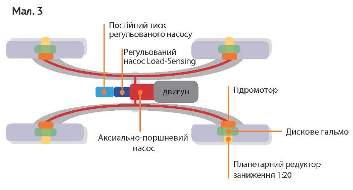 Цікавий момент: на старті та при роботі в складних умовах через великий діаметр колеса потрібен високий крутний момент, який у PANTERA 4502-H створюється механічно через знижувальний планетарний редуктор. Потік оливи до гідромоторів подає аксиально-поршневий насос. При цьому завдяки системі автоматичного регулювання приводу коліс за частотою обертання кожен гідромотор регулюється індивідуально. (мал. 3)