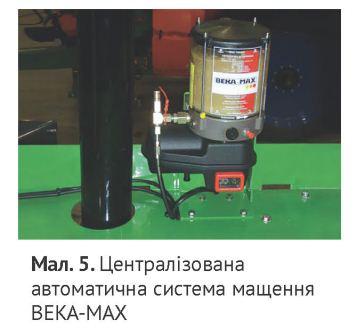 В цьому допомагає й централізована система мащення BEKA-MAX, яка автоматично та з необхідною періодичністю змащує всі важливі точки змазки самохідного обприскувача (мал. 5).