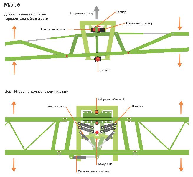 При наїзді на перешкоду спрацювала й багаторівнева система стабілізації штанг (мал. 6), завдяки чому вони майже не ворухнулись. «Довжина штанг становить 36 м, — зазначає Сергій Горчинський. — Ми замовили таку, бо працюємо під технологічні колії під два обприскувача із захватом по 36 м». За своїми характеристиками штанги багато в чому нагадують… крила літака. Адже легкі, міцні, компактні і довговічні штанги Super — L2 кожного разу підтверджують свої високі функціональні властивості завдяки особливій профільній конструкції AMAZONE. Так, на цьому обприскувачі їхня транспортна ширина становить лише 2,55 м. При цьому вони розміщуються за кабіною, не обмежуючи огляд. Завдяки системі гашення коливань та гідравлічному регулюванню на схилі вони навіть за високої швидкості, маючи найменші коливання, перебувають у горизонтальному положенні. За висотою штанги регулюються із 0,5 до 2,5 м.