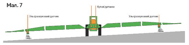 «Веденням штанг на Пантері займається комп’ютер, — додає Олександр Луцик, — тут стоїть система AutoLift, яка при кожному вимкненні машини підіймає штангу на задану висоту, а з початком роботи — опускає. У нас ще стоїть система DistanceControl. Вона працює так: ультразвукові датчики сканують поверхню над рослинами. Інформація поступає до бортового комп’ютера, який автоматично тримає штангу в горизонтальному положенні та на заданому рівні незалежно від нахилу машини. Для виконання розвороту штанги підіймаються в автоматичному режимі». (мал. 7)
